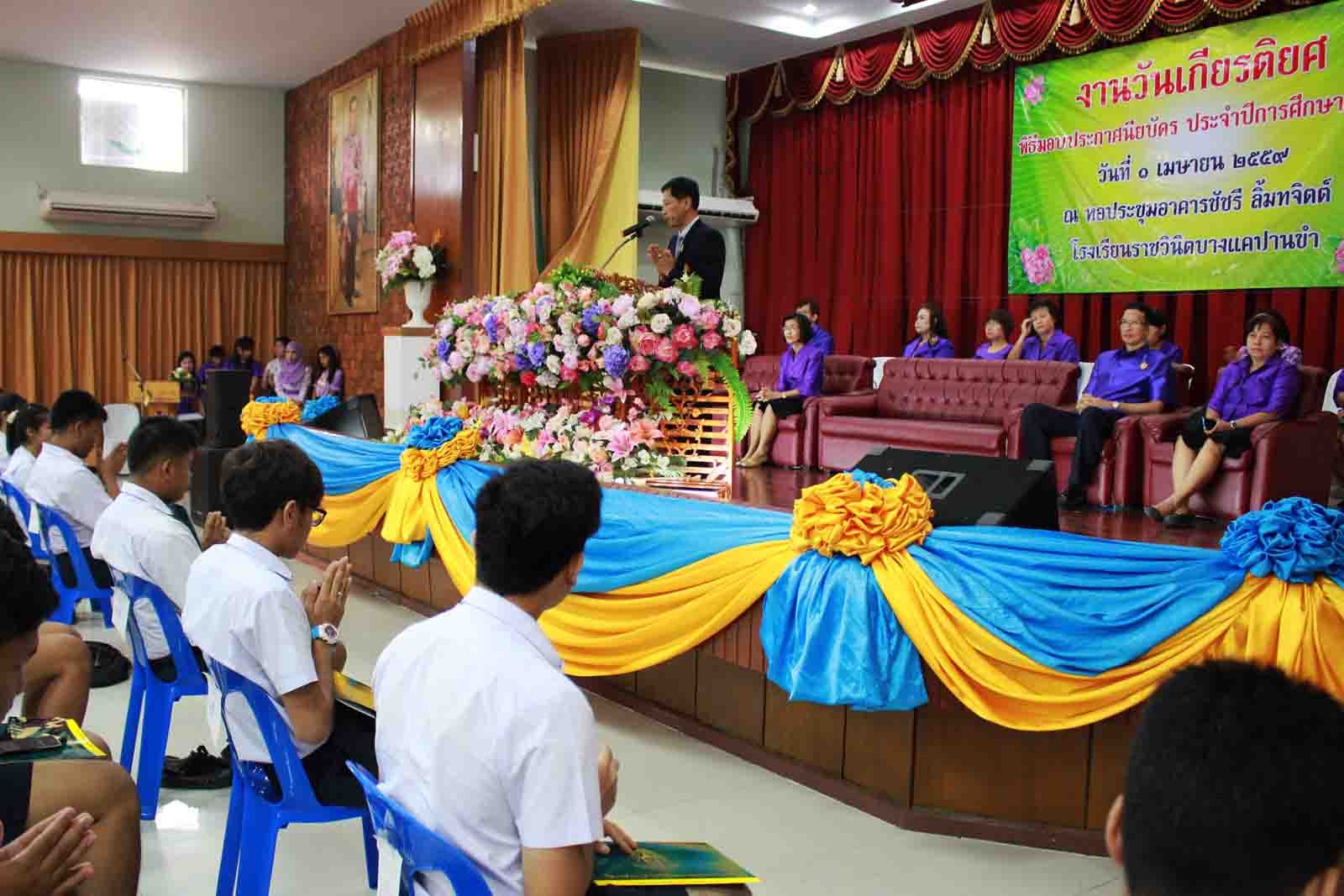 พิธีมอบประกาศนียบัตร ประจำปีการศึกษา 2558 ให้กับนักเรียนที่จบการศึกษาระดับชั้นมัธยมศึกษาปีที่ 3 จำนวน 276 คน และระดับชั้นมัธยมศึกษาปีที่ 6 จำนวน 225 คน รวมจำนวนนักเรียนที่รับประกาศนียบัตรทั้งสิ้น 501 คน