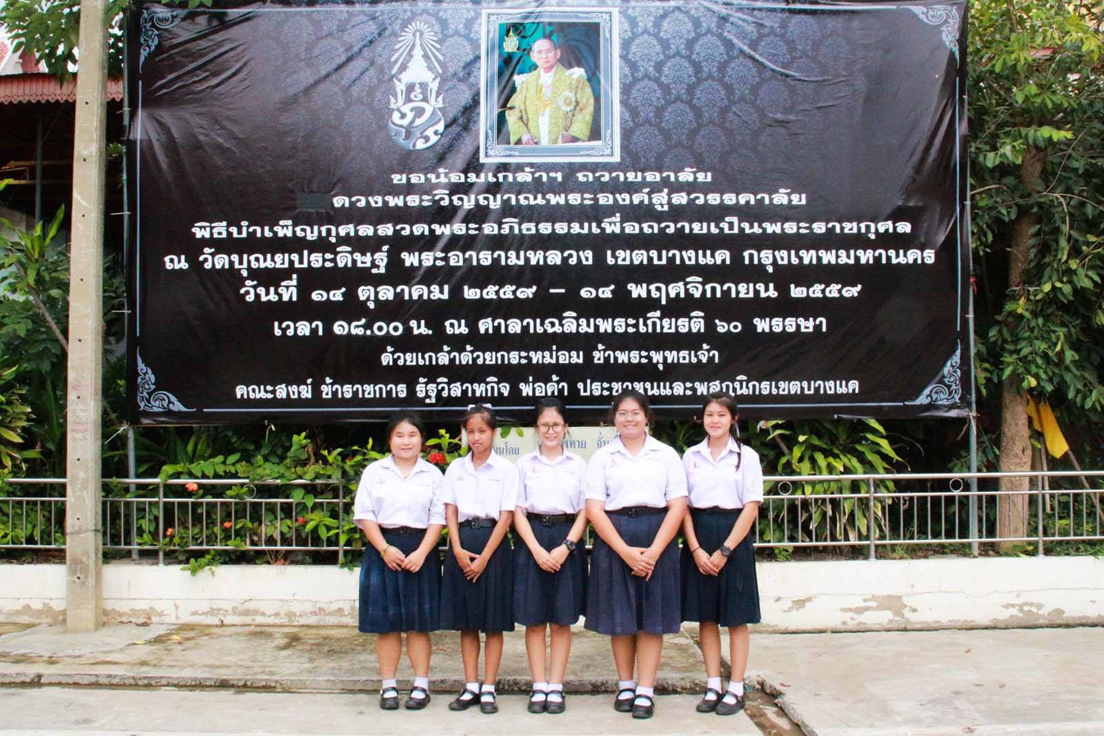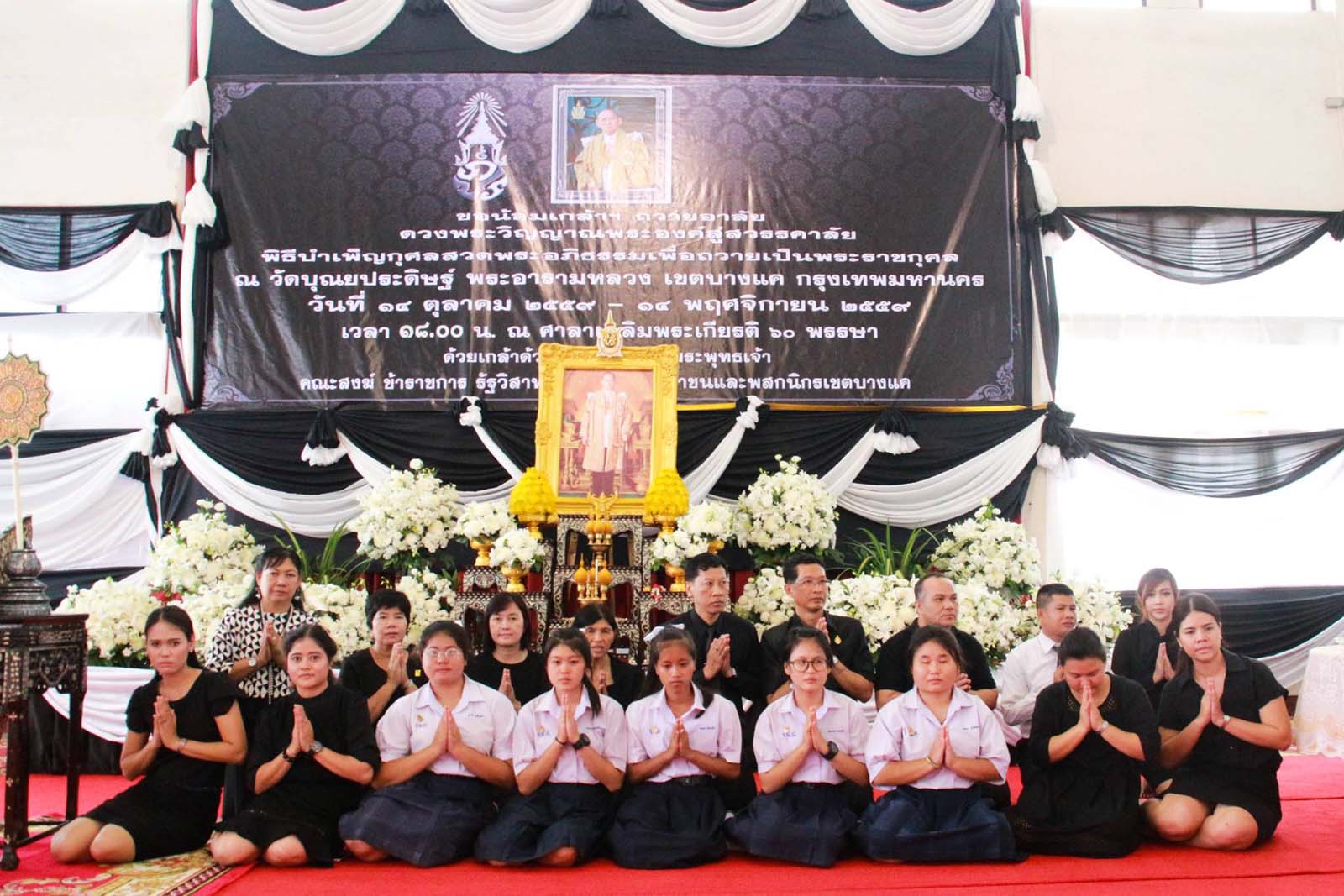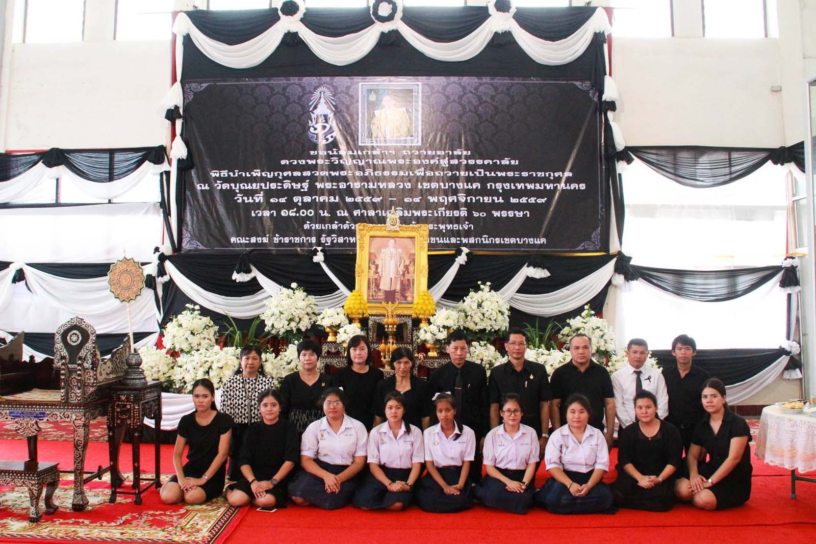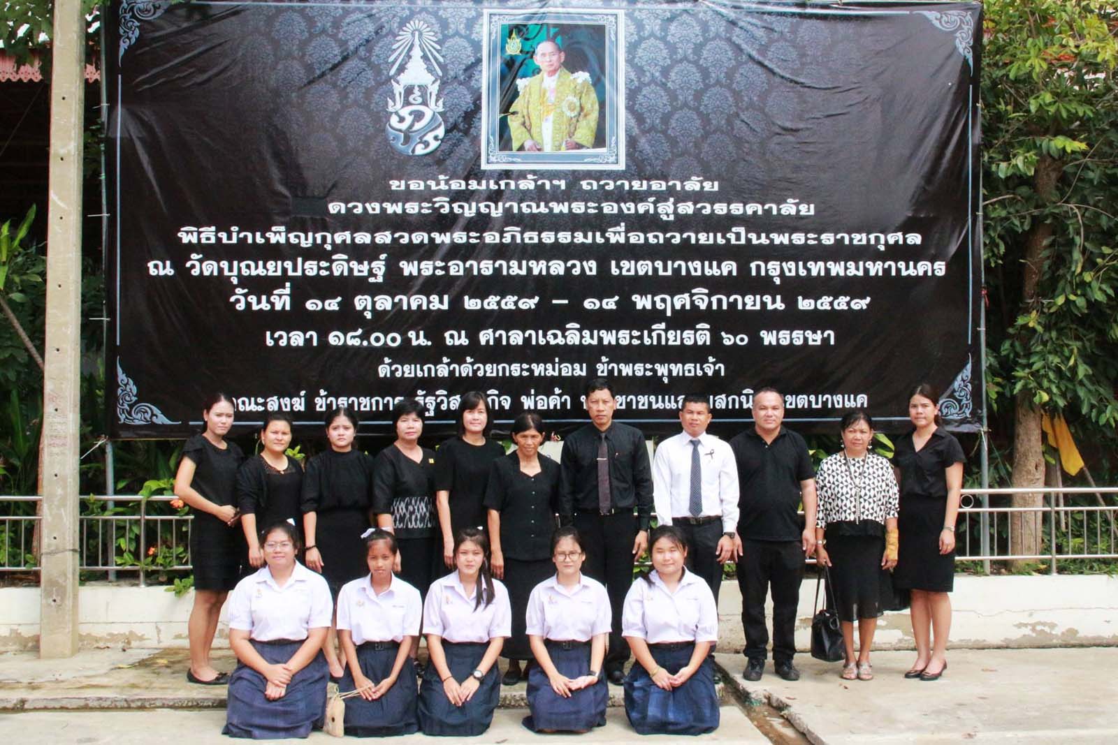 นายธนะกุล ช้อนแก้ว ผู้อำนวยการโรงเรียนราชวินิตบางแคปานขำ ได้นำคณะครู บุคลากรทางการศึกษาและนักเรียน เข้าร่วมในพิธีบำเพ็ญกุศลสวดอภิธรรมเพื่อถวายเป็นพระราชกุศล วันที่ ๑๔ ตุลาคม - ๑๔ พฤศจิกายน ๒๕๕๙ ณ ศาลาเฉลิมพระเกียรติ ๖๐ พรรษา วัดบุณยประดิษฐ์ พระอารามหลวง เขตบางแค กรุงเทพมหานคร |