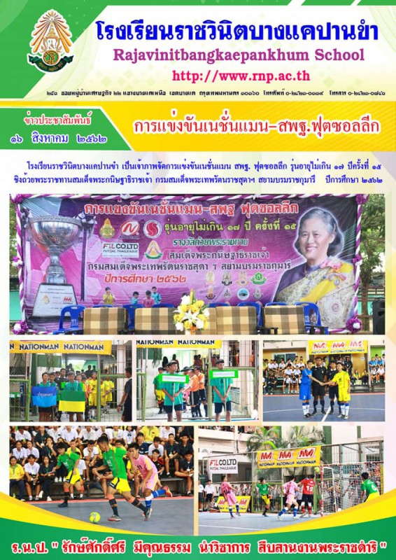 โรงเรียนราชวินิตบางแคปานขำ เป็นเจ้าภาพจัดการแข่งขันเนชั่นแมน สพฐ. ฟุตซอลลีก รุ่นอายุไม่เกิน ๑๗ ปีครั้งที่ ๑๕ ชิงถ้วยพระราชทานสมเด็จพระกนิษฐาธิราชเจ้า กรมสมเด็จพระเทพรัตนราชสุดาฯ สยามบรมราชกุมารี ปีการศึกษา ๒๕๖๒ |