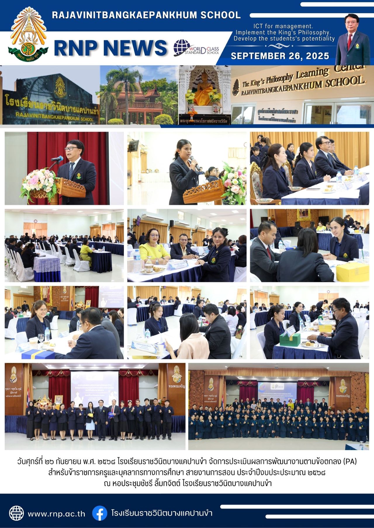 วันศุกร์ที่ ๒๖ กันยายน พ.ศ. ๒๕๖๘ โรงเรียนราชวินิตบางแคปานขำ จัดการประเมินผลการพัฒนางานตามข้อตกลง (PA) สำหรับข้าราชการครูและบุคลากรทางการศึกษา สายงานการสอน ประจำปีงบประประมาณ ๒๕๖๘ ณ หอประชุมชัชรี ลิ้มทจิตต์ โรงเรียนราชวินิตบางแคปานขำ |