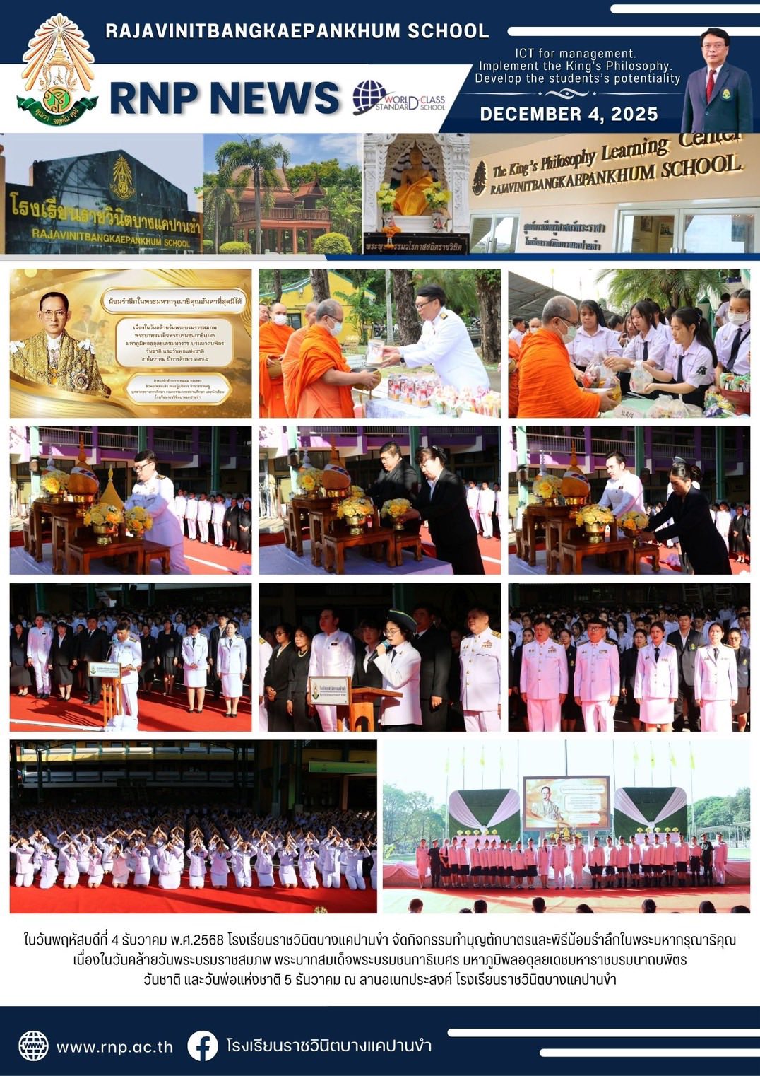 | ในวันพฤหัสบดีที่ 4 ธันวาคม พ.ศ.2568 โรงเรียนราชวินิตบางแคปานขำ จัดกิจกรรมทำบุญตักบาตรและพิธีน้อมรำลึกในพระมหากรุณาธิคุณเนื่องในวันคล้ายวันพระบรมราชสมภพ พระบาทสมเด็จพระบรมชนกาธิเบศร มหาภูมิพลอดุลยเดชมหาราช บรมนาถบพิตร วันชาติ และวันพ่อแห่งชาติ 5 ธันวาคม ณ ลานอเนกประสงค์ โรงเรียนราชวินิตบางแคปานขำ |