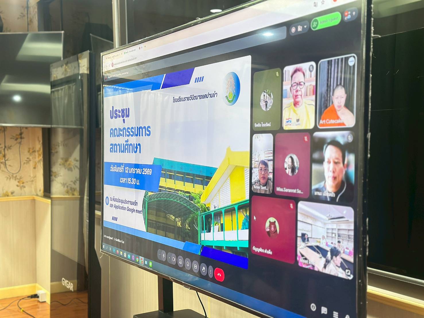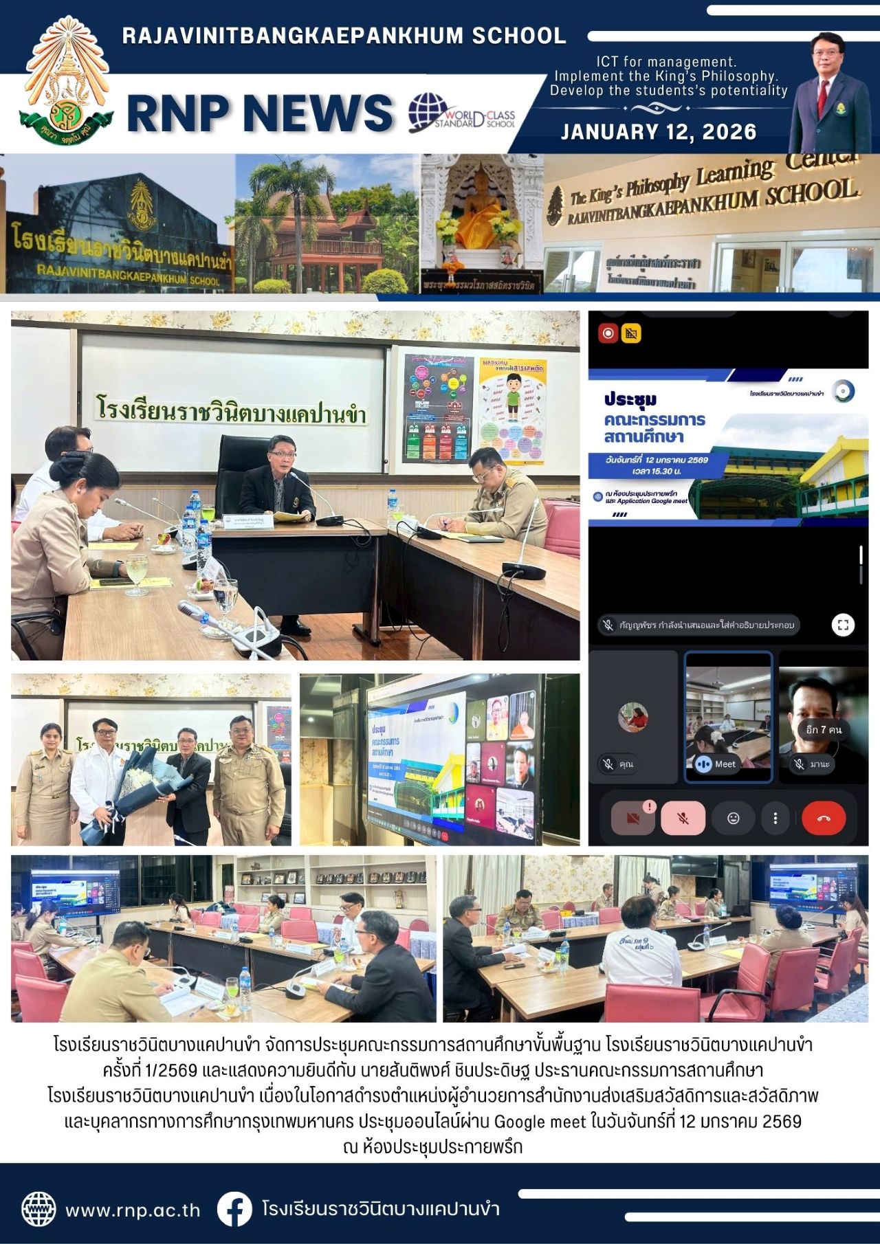 | โรงเรียนราชวินิตบางแคปานขำ จัดการประชุมคณะกรรมการสถานศึกษาขั้นพื้นฐาน โรงเรียนราชวินิตบางแคปานขำ ครั้งที่ 1/2569 และแสดงความยินดีกับ นายสันติพงศ์ ชินประดิษฐ ประธานคณะกรรมการสถานศึกษา โรงเรียนราชวินิตบางแคปานขำ เนื่องในโอกาสดำรงตำแหน่งผู้อำนวยการสำนักงานส่งเสริมสวัสดิการและสวัสดิภาพ และบุคลากรทางการศึกษากรุงเทพมหานคร ประชุมออนไลน์ผ่าน Google meet ในวันจันทร์ที่ 12 มกราคม 2569 ณ ห้องประชุมประกายพรึก |