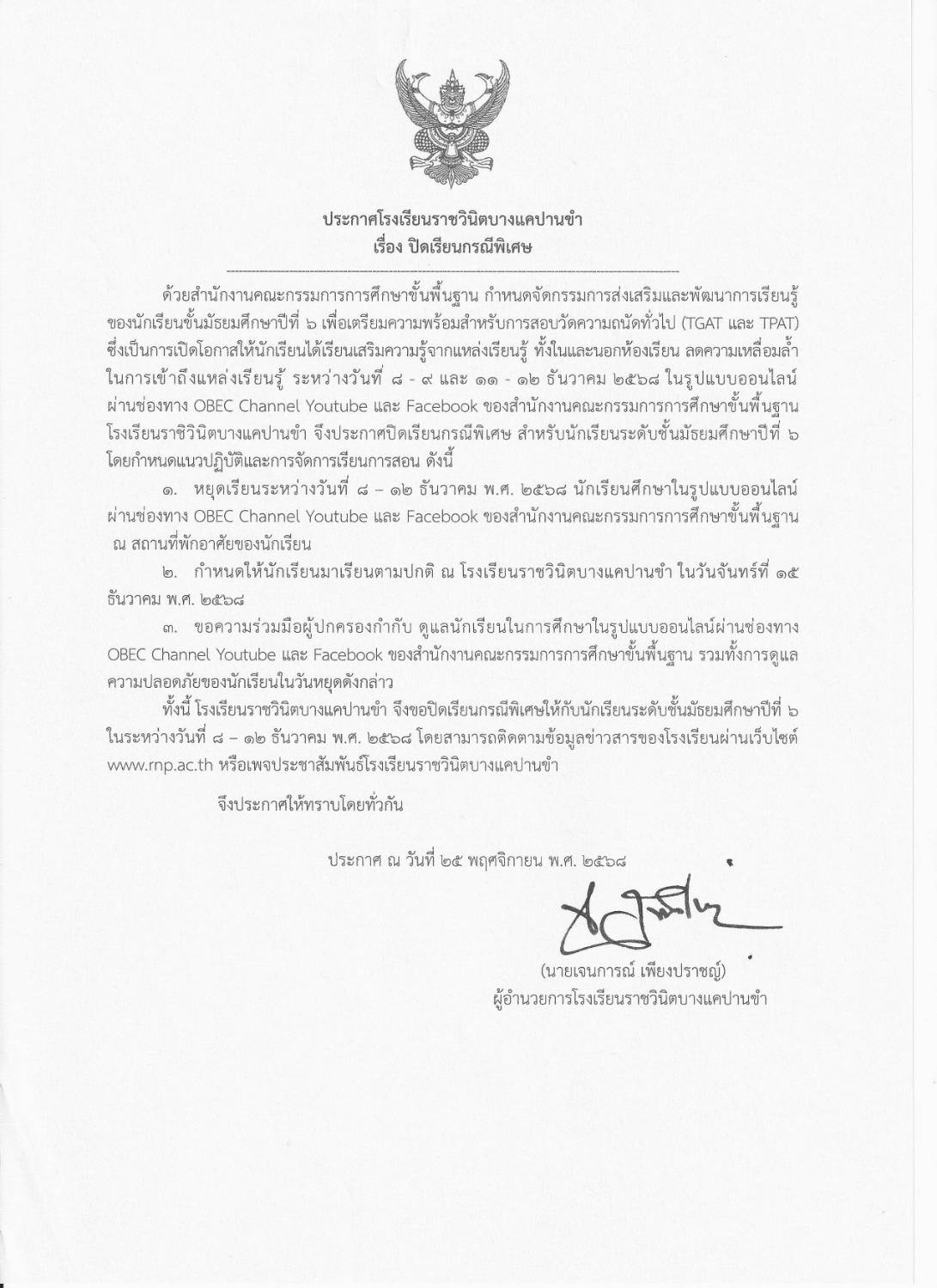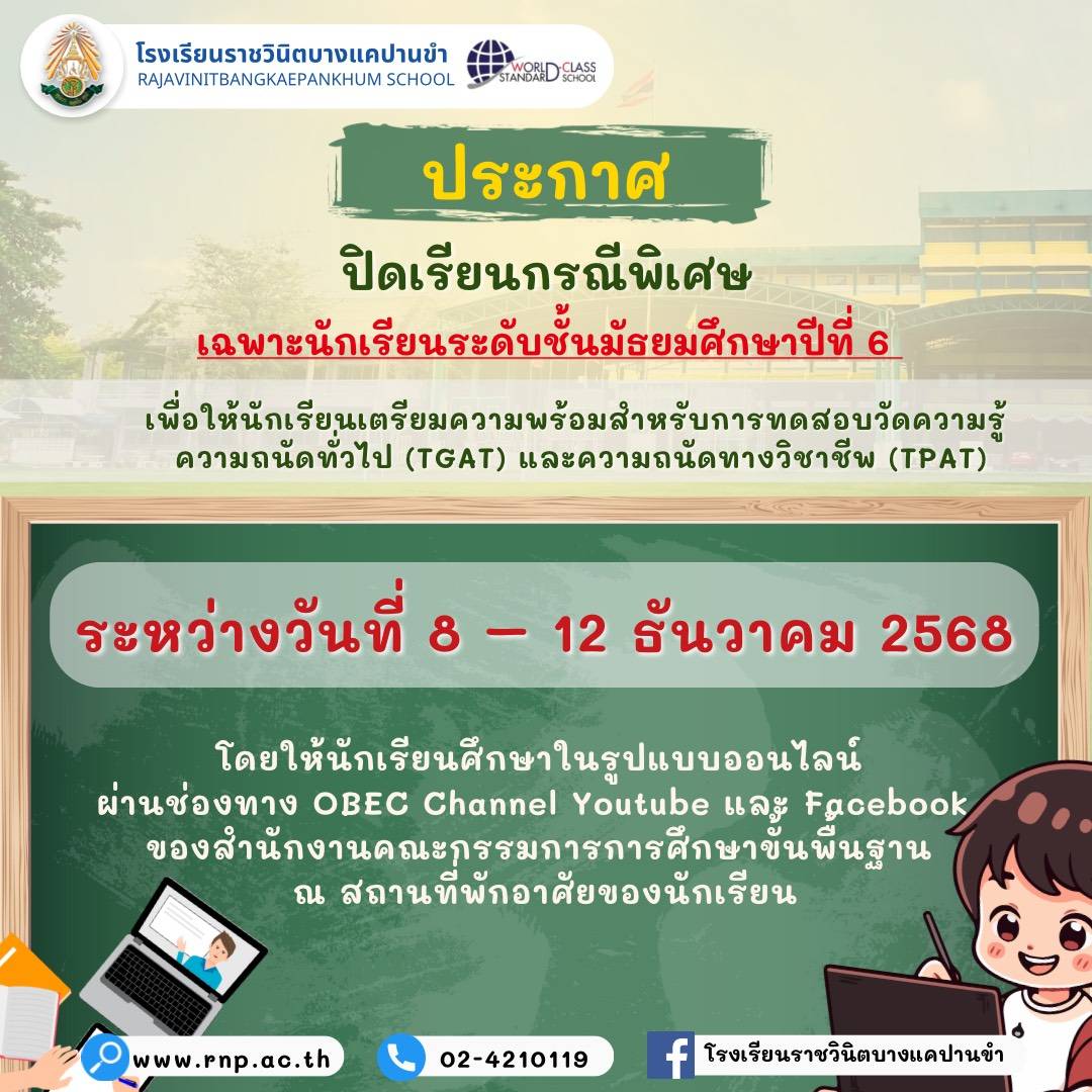 ประกาศ เรื่อง ปิดเรียนกรณีพิเศษสำหรับนักเรียนระดับชั้นมัธยมศึกษาปีที่ 6 ตั้งแต่วันจันทร์ที่ 8 - 12 ธันวาคม พ.ศ. 2568 เพื่อเตรียมความพร้อมสำหรับการสอบวัดความถนัดทั่วไป (TGAT และ TPAT)