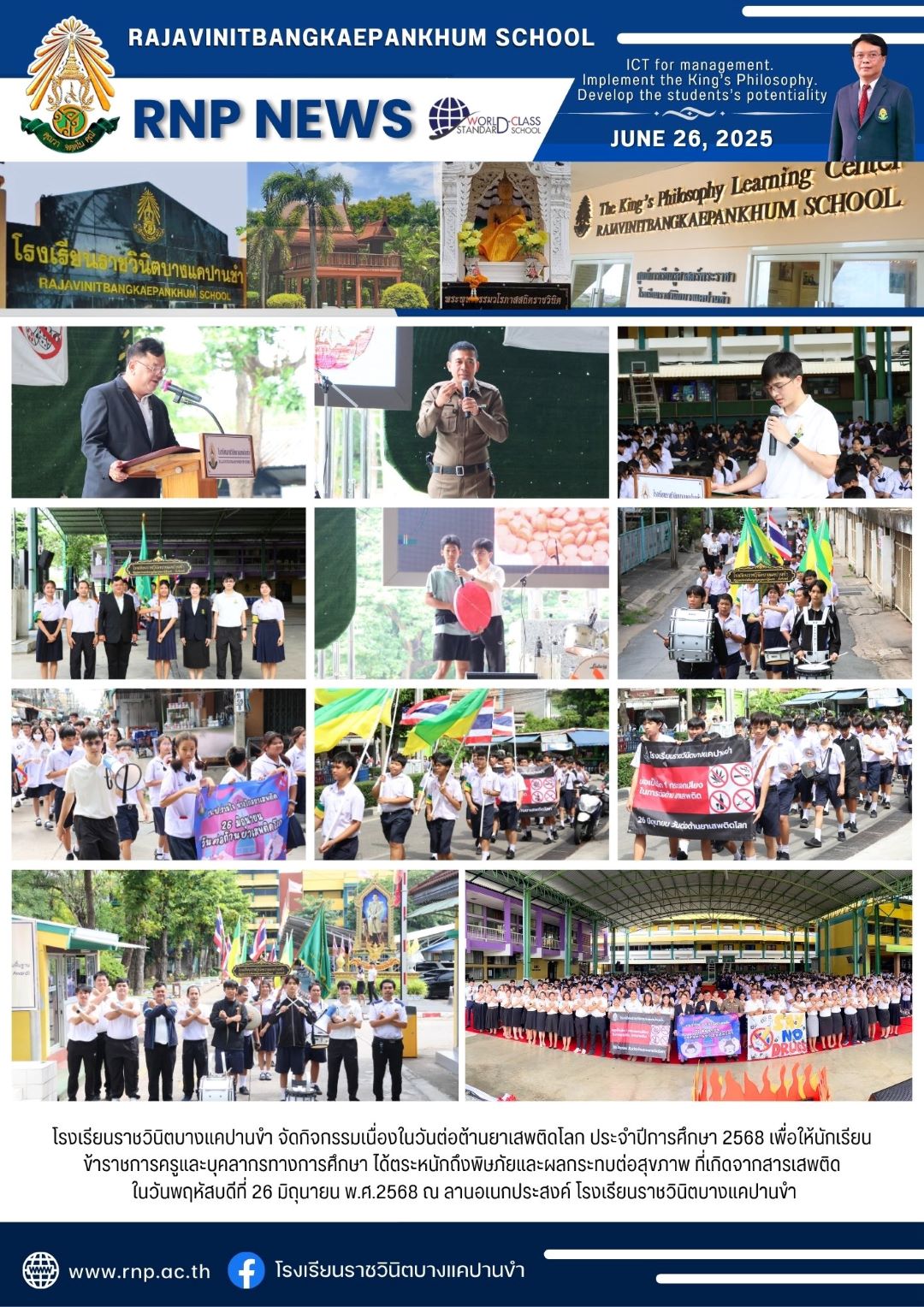 โรงเรียนราชวินิตบางแคปานขำ จัดกิจกรรมเนื่องในวันต่อต้านยาเสพติดโลก ประจำปีการศึกษา 2568 เพื่อให้นักเรียน ข้าราชการครูและบุคลากรทางการศึกษา ได้ตระหนักถึงพิษภัยและผลกระทบต่อสุขภาพ ที่เกิดจากสารเสพติด ในวันพฤหัสบดีที่ 26 มิถุนายน พ.ศ.2568 ณ ลานอเนกประสงค์ โรงเรียนราชวินิตบางแคปานขำ |