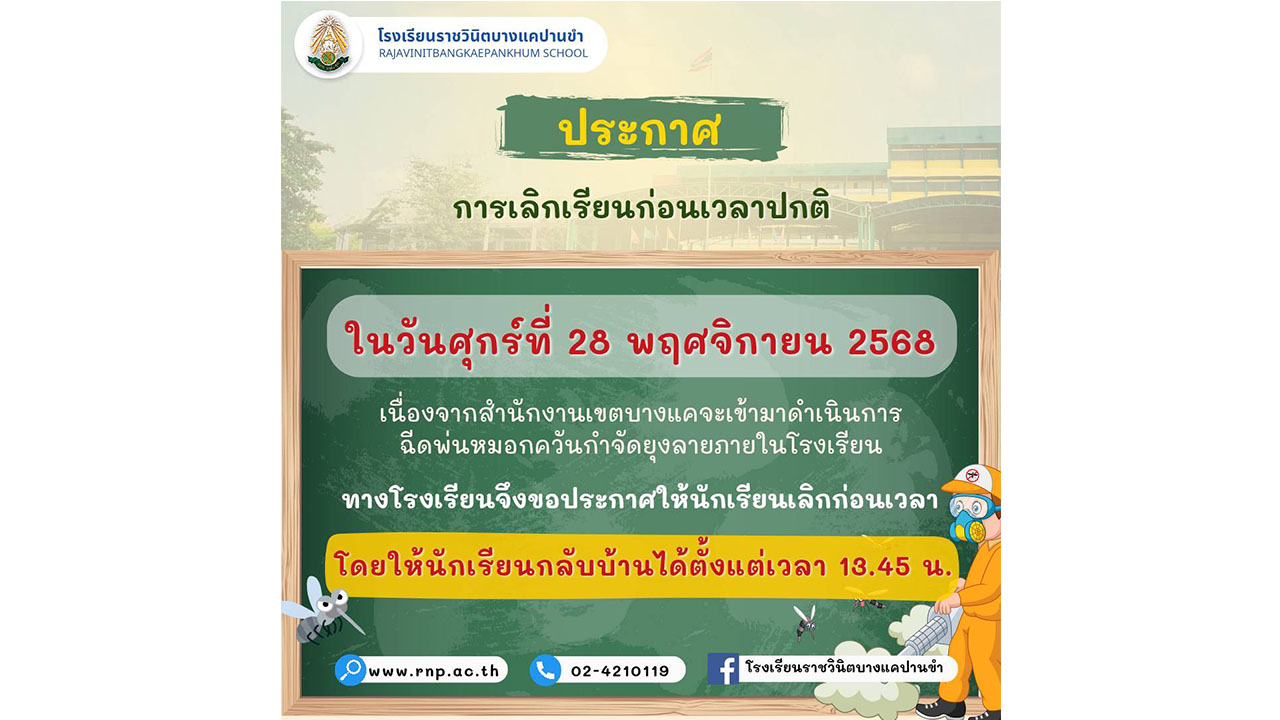 ประกาศโรงเรียนราชวินิตบางแคปานขำ เรื่อง การเลิกเรียนก่อนเวลาปกติ เนื่องจากทางสำนักงานเขตบางแคจะเข้ามาดำเนินการฉีดพ่นหมอกควันกำจัดยุงลายภายในโรงเรียนในวันศุกร์ที่ 28 พฤศจิกายน พ.ศ. 2567 25 พ.ย. 68