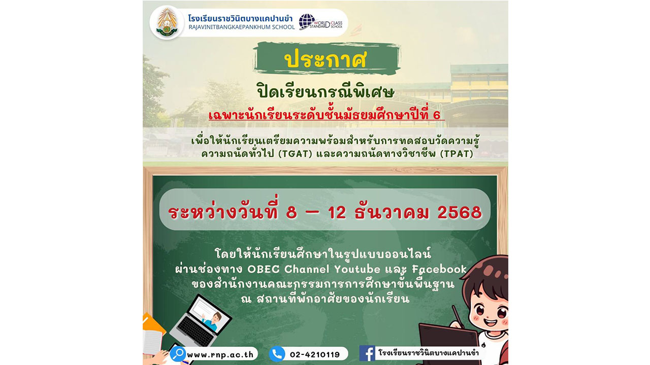 ประกาศ เรื่อง ปิดเรียนกรณีพิเศษสำหรับนักเรียนระดับชั้นมัธยมศึกษาปีที่ 6 ตั้งแต่วันจันทร์ที่ 8 - 12 ธันวาคม พ.ศ. 2568 เพื่อเตรียมความพร้อมสำหรับการสอบวัดความถนัดทั่วไป (TGAT และ TPAT) 01 ธ.ค. 68