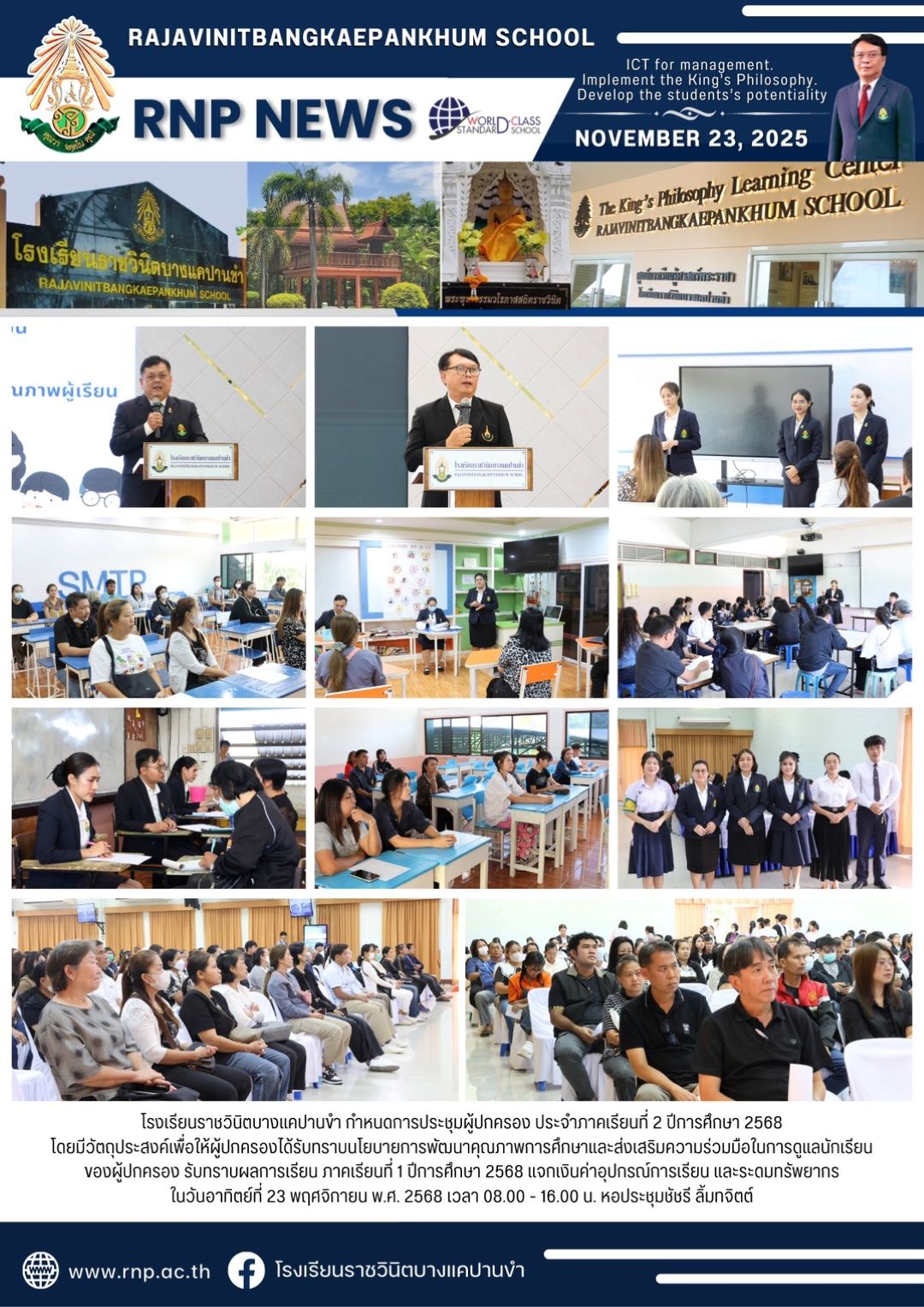 | โรงเรียนราชวินิตบางแคปานขำ กำหนดการประชุมผู้ปกครอง ประจำภาคเรียนที่ 2 ปีการศึกษา 2568 โดยมีวัตถุประสงค์เพื่อให้ผู้ปกครองได้รับทราบนโยบายการพัฒนาคุณภาพการศึกษาและส่งเสริมความร่วมมือในการดูแลนักเรียนของผู้ปกครอง รับทราบผลการเรียน ภาคเรียนที่ 1 ปีการศึกษา 2568 แจกเงินค่าอุปกรณ์การเรียน และระดมทรัพยากร ในวันอาทิตย์ที่ 23 พฤศจิกายน พ.ศ. 2568 เวลา 08.00 - 16.00 น. หอประชุมชัชรี ลิ้มทจิตต์ |