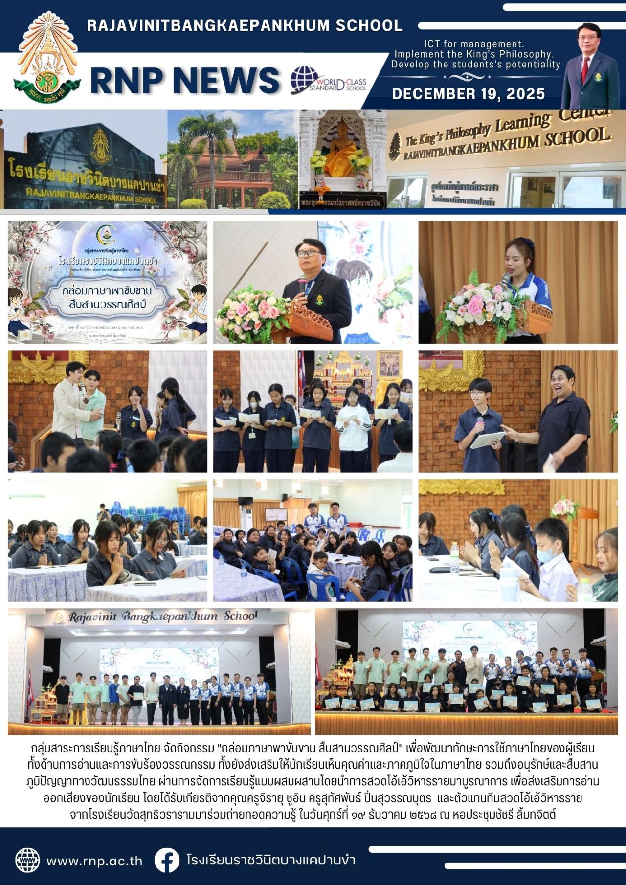 | กลุ่มสาระการเรียนรู้ภาษาไทย ได้จัดกิจกรรม "กล่อมภาษาพาขับขาน สืบสานวรรณศิลป์" เพื่อพัฒนาทักษะการใช้ภาษาไทยของผู้เรียนทั้งด้านการอ่านและการขับร้องวรรณกรรม ทั้งยังส่งเสริมให้นักเรียนเห็นคุณค่าและภาคภูมิใจในภาษาไทย รวมถึงอนุรักษ์และสืบสานภูมิปัญญาทางวัฒนธรรมไทย ผ่านการจัดการเรียนรู้แบบผสมผสานโดยนำการสวดโอ้เอ้วิหารรายมาบูรณาการ เพื่อส่งเสริมการอ่านออกเสียงของนักเรียน โดยได้รับเกียรติจากคุณครูจิรายุ ชูอิน ครูสุทัศพันธ์ ปิ่นสุวรรณบุตร และตัวแทนทีมสวดโอ้เอ้วิหารรายจากโรงเรียนวัดสุทธิวรารามมาร่วมถ่ายทอดความรู้ ในวันศุกร์ที่ ๑๙ ธันวาคม ๒๕๖๘ ณ หอประชุมชัชรี ลิ้มทจิตต์ |