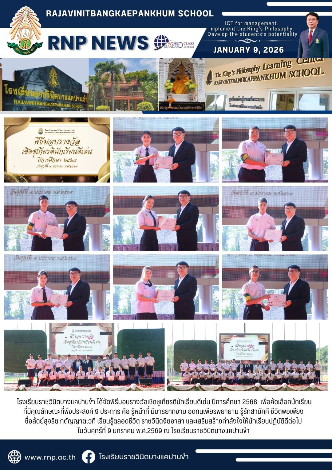 | โรงเรียนราชวินิตบางแคปานขำ ได้จัดพิธีมอบรางวัลเชิดชูเกียรตินักเรียนดีเด่น ปีการศึกษา 2568 เพื่อคัดเลือกนักเรียนที่มีคุณลักษณะที่พึงประสงค์ 9 ประการ คือ รู้หน้าที่ มีมารยาทงาม อดทนเพียรพยายาม รู้รักสามัคคี ชีวิตพอเพียง ชื่อสัตย์สุจริต กตัญญาตเวที เรียนรู้ตลอดชีวิต ราชวินิตจิตอาสา และเสริมสร้างกำลังใจให้นักเรียนปฏิบัติดีต่อไป ในวันศุกร์ที่ 9 มกราคม พ.ศ.2569 ณ โรงเรียนราชวินิตบางแคปานขำ |