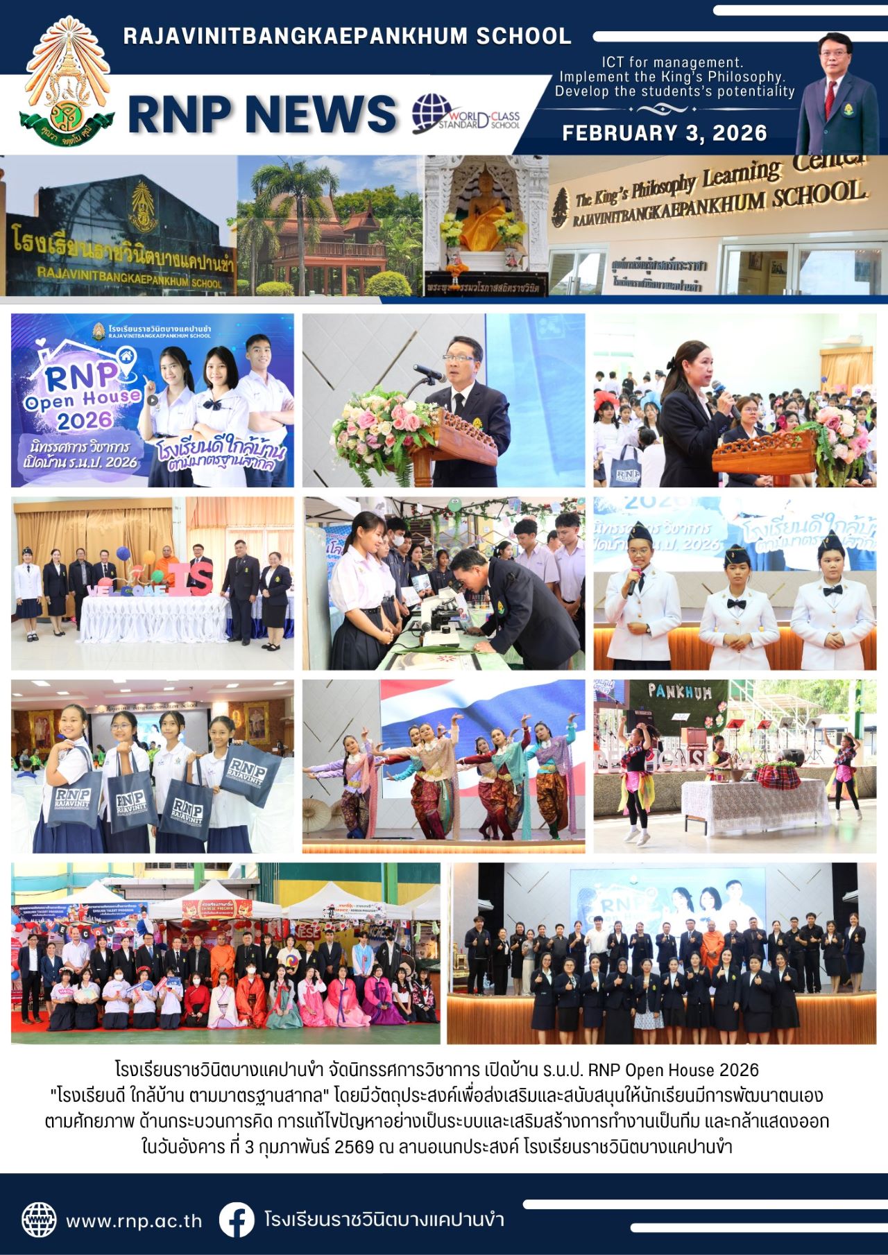 | โรงเรียนราชวินิตบางแคปานขำ จัดนิทรรศการวิชาการ เปิดบ้าน ร.น.ป. RNP Open House 2026 "โรงเรียนดี ใกล้บ้าน ตามมาตรฐานสากล" โดยมีวัตถุประสงค์เพื่อส่งเสริมและสนับสนุนให้นักเรียนมีการพัฒนาตนเอง ตามศักยภาพ ด้านกระบวนการคิด การแก้ไขปัญหาอย่างเป็นระบบและเสริมสร้างการทำงานเป็นทีม และกล้าแสดงออก ในวันอังคาร ที่ 3 กุมภาพันธ์ 2569 ณ ลานอเนกประสงค์ โรงเรียนราชวินิตบางแคปานขำ |
