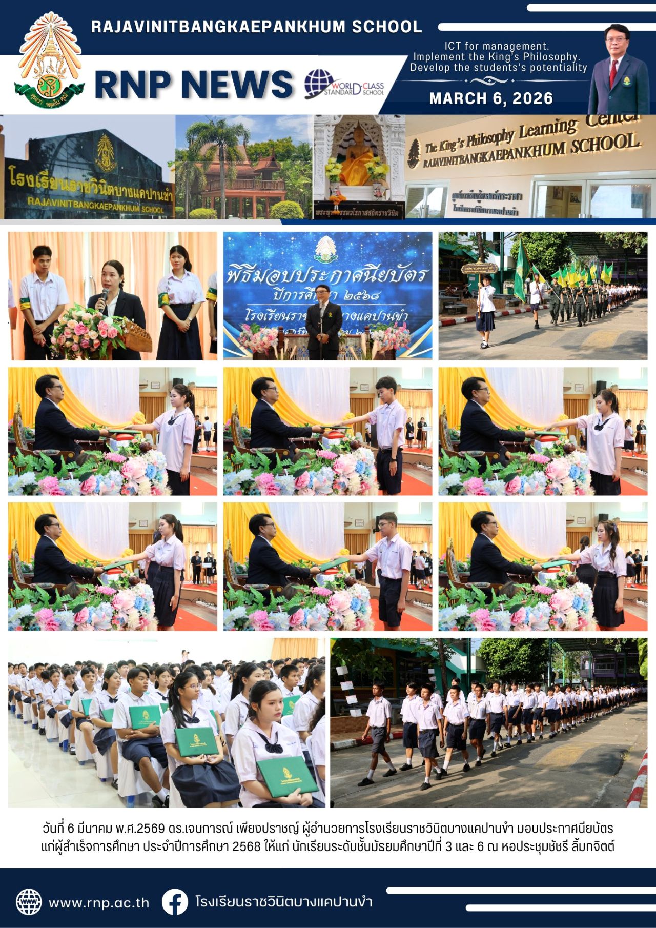 | วันที่ 6 มีนาคม พ.ศ.2569 ดร.เจนการณ์ เพียงปราชญ์ ผู้อำนวยการโรงเรียนราชวินิตบางแคปานขำ มอบประกาศนียบัตร แก่ผู้สำเร็จการศึกษา ประจำปีการศึกษา 2568 ให้แก่ นักเรียนระดับชั้นมัธยมศึกษาปีที่ 3 และ 6 ณ หอประชุมชัชรี ลิ้มทจิตต์ |