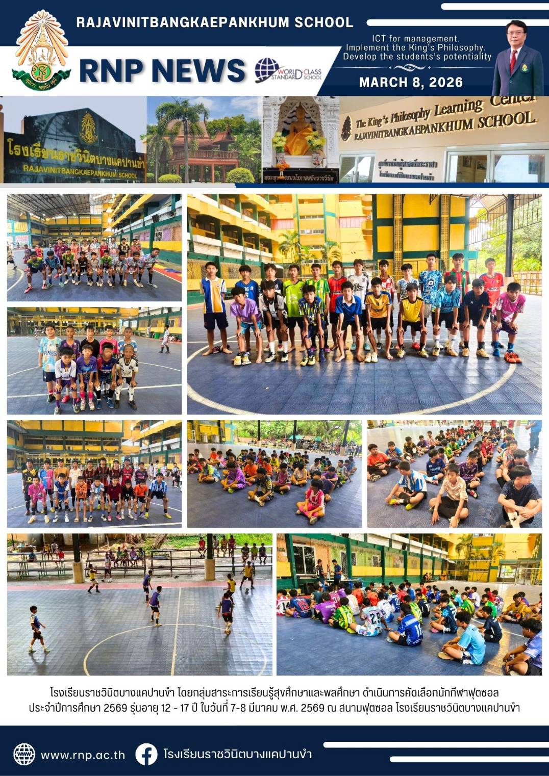 | โรงเรียนราชวินิตบางแคปานขำ โดยกลุ่มสาระการเรียนรู้สุขศึกษาและพลศึกษา ดำเนินการคัดเลือกนักกีฬาฟุตซอล ประจำปีการศึกษา 2569 รุ่นอายุ 12 - 17 ปี ในวันที่ 7-8 มีนาคม พ.ศ. 2569 ณ สนามฟุตซอล โรงเรียนราชวินิตบางแคปานขำ |