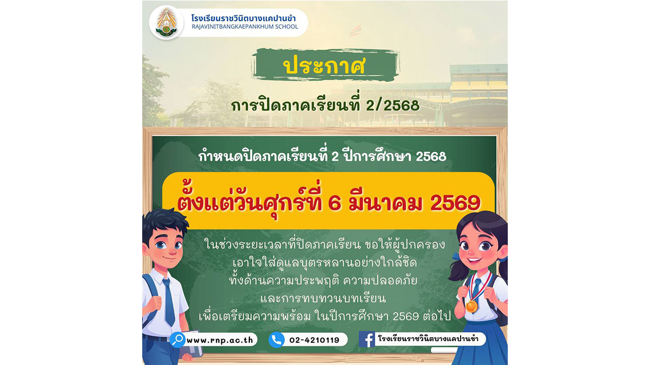ประกาศโรงเรียนราชวินิตบางแคปานขำ เรื่อง การปิดภาคเรียนที่ 2 ปีการศึกษา 2568 04 มี.ค. 69