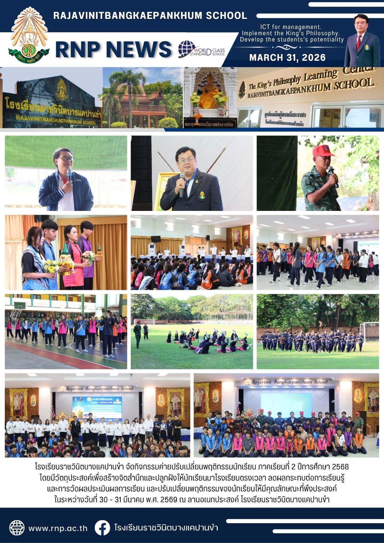 | โรงเรียนราชวินิตบางแคปานขำ จัดกิจกรรมค่ายปรับเปลี่ยนพฤติกรรมนักเรียน ภาคเรียนที่ 2 ปีการศึกษา 2568 โดยมีวัตถุประสงค์เพื่อสร้างจิตสำนึกและปลูกฝังให้นักเรียนมาโรงเรียนตรงเวลา ลดผลกระทบต่อการเรียนรู้ และการวัดผลประเมินผลการเรียน และปรับเปลี่ยนพฤติกรรมของนักเรียนให้มีคุณลักษณะที่พึงประสงค์ ในระหว่างวันที่ 30 - 31 มีนาคม พ.ศ. 2569 ณ ลานอเนกประสงค์ โรงเรียนราชวินิตบางแคปานขำ |
